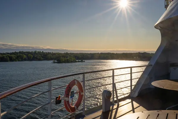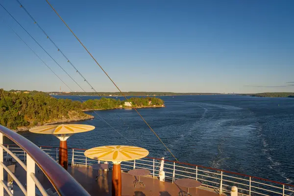 Anschließend zog es uns hinauf an Deck. Heute war der Wind deutlich angenehmer als am Vortag und so konnten wir die ersten Kilometer der Ausfahrt von oben genießen. Der Blick über das weite Wasser, die Inseln im Morgenlicht und die langsam kleiner werdende Skyline von Stockholm machten diesen Moment zu einem ganz besonderen Abschluss unserer Zeit im Schärengarten.
