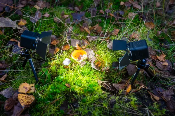 Mit zwei Lampen links und rechts, entsteht sofort eine Miniatur-Bühne mitten im Wald. Die Barndoors sind dabei Gold wert: Sie verhindern Streulicht und lenken das Licht dorthin, wo es gebraucht wird – ideal für feine Details zum Beisiel an den Lamellen.